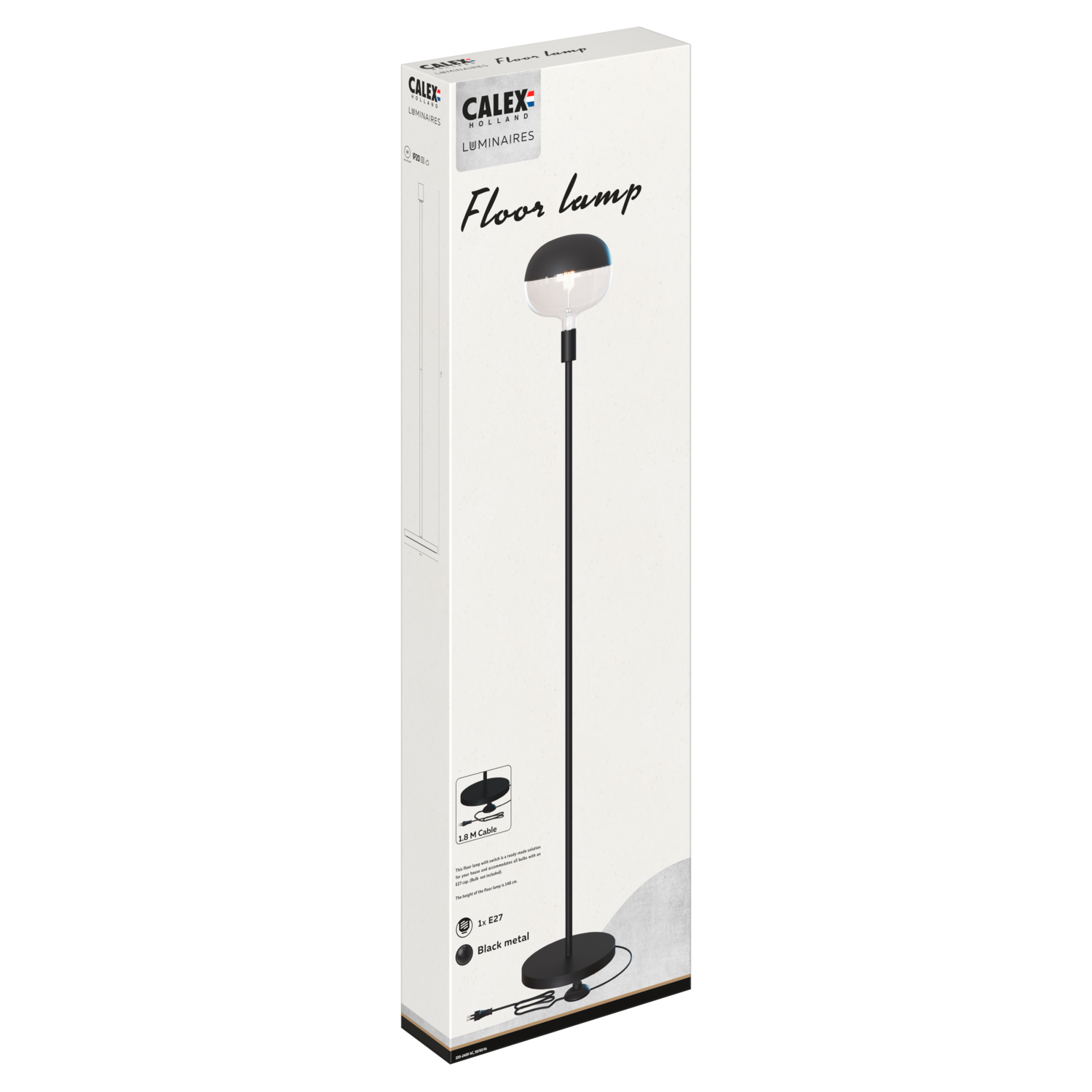 The Calex Floor Lamp E27 is a black floor lamp with a metal housing and an easy-to-operate on/off switch on the cable. Thanks to its timeless design and generous cable length of 1.8 meters, you can place it flexibly wherever you need lighting. The lamp has a sturdy base measuring 26 cm (diameter) and a total height of 146 cm.