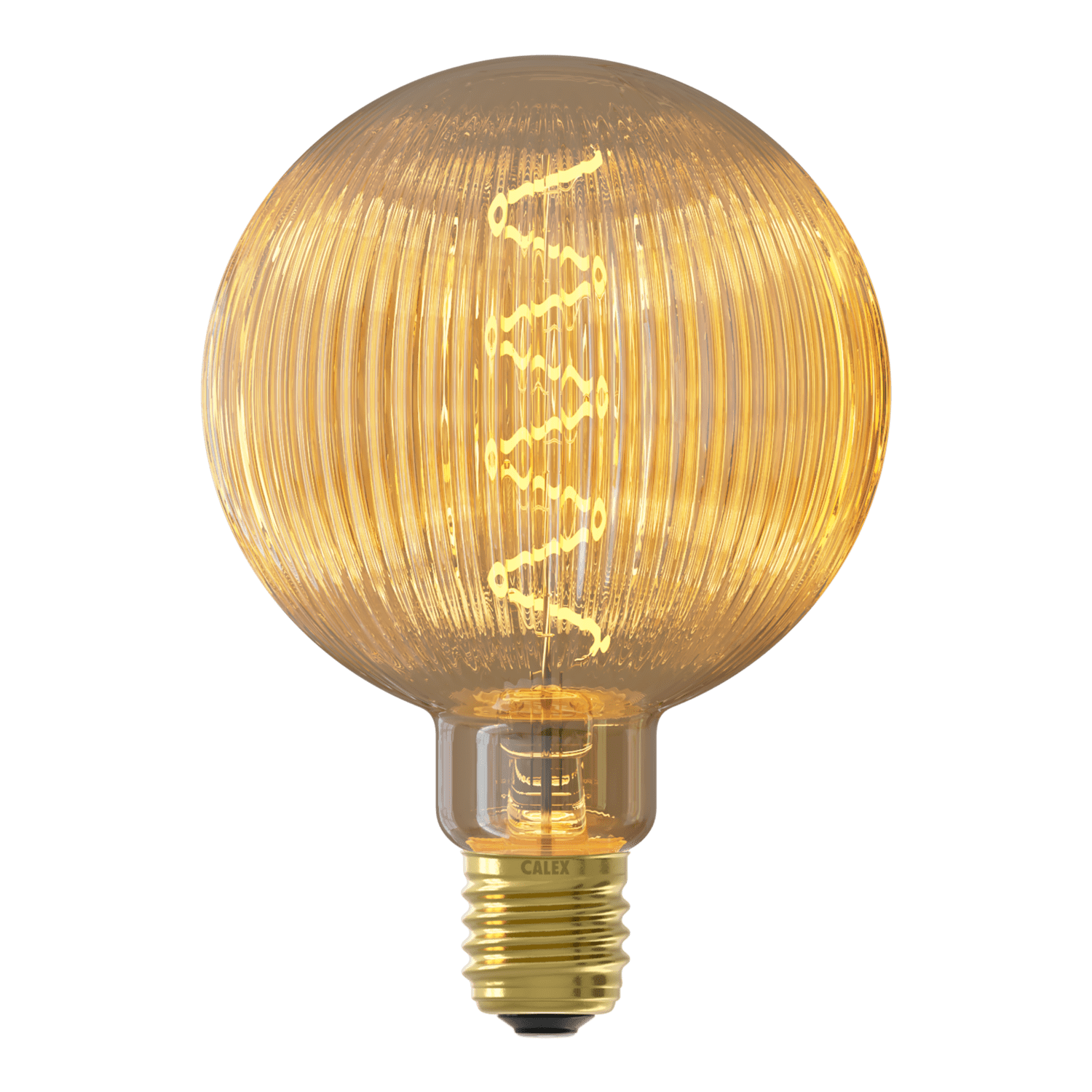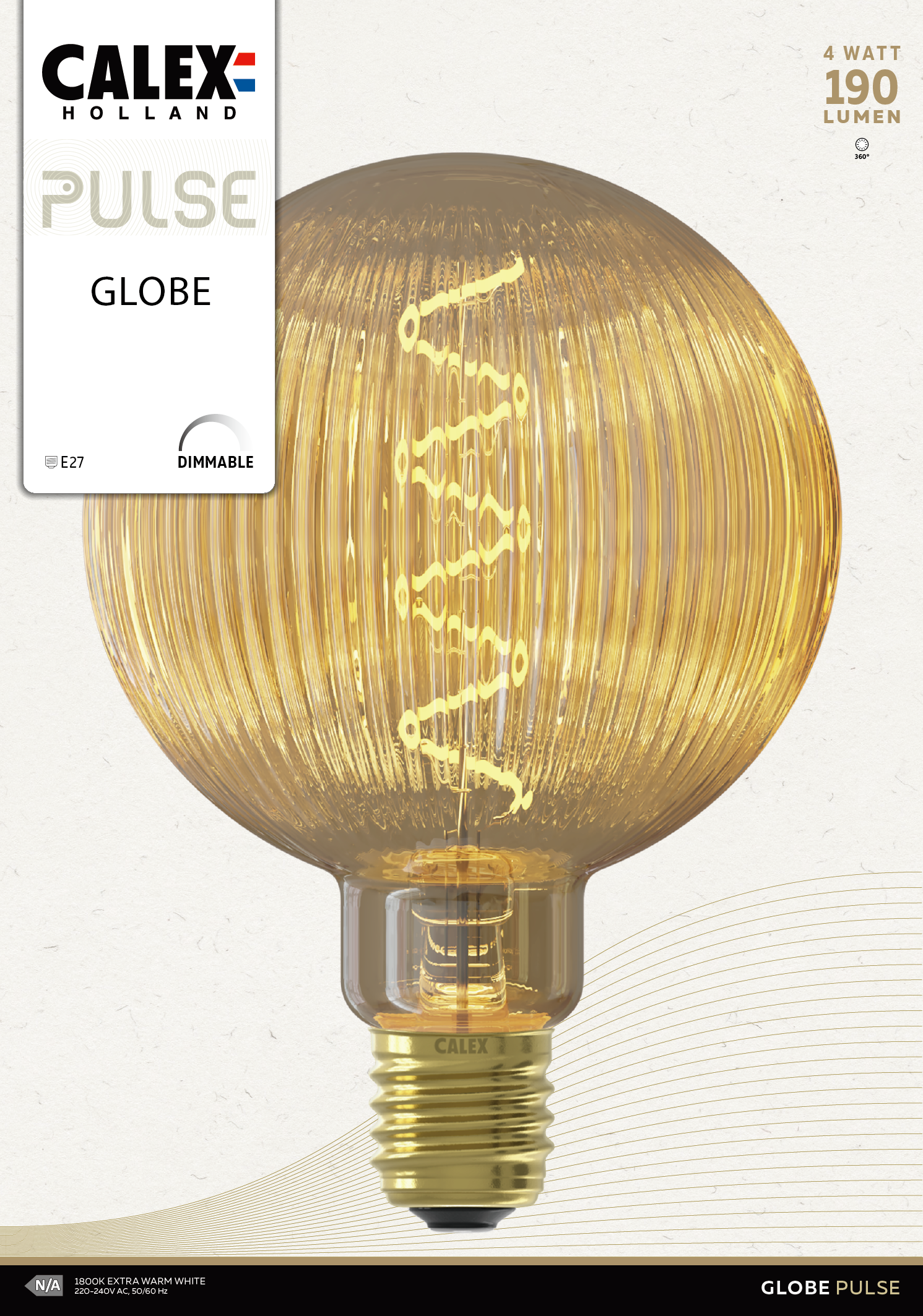 Bring a warm, elegant atmosphere to your space with this Calex Pulse Nantes G125. The golden ribbed glass gives the bulb a refined and vintage look. The extra warm light of 1800K creates a cosy ambiance. With a power consumption of only 4W and a light output of 190 lumens, this bulb offers an energy-efficient solution with lots of character.