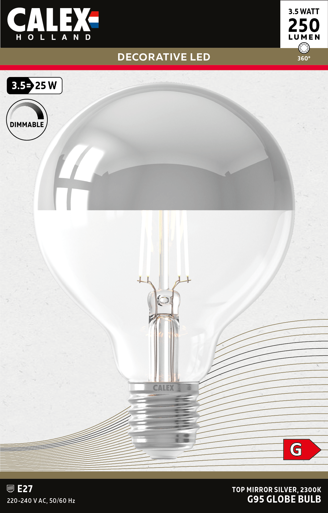 The model has a diameter of 95 mm, a height of 140 mm and is sent for fittings with E27 schroefdraad. This silver bowl-mirror (G95) uses 3.5 watts, has a lifetime of 15.000 hours and has a light intensity of 250 Lumen. Dimmable with a LED dimmer.