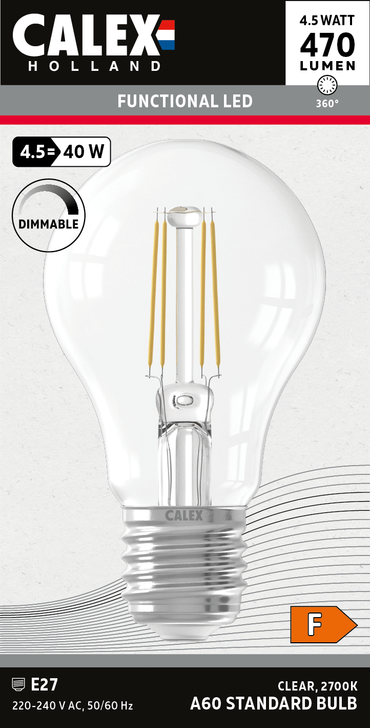 This model has a diameter of 60 mm, a hight of 105 mm and is suitable for fittings with an E27 screw thread. The bright light source of the model A60 has an output of 470 Lumen, uses 4.5 Watt and has a colour temperature of 2700 Kelvin (warm light)