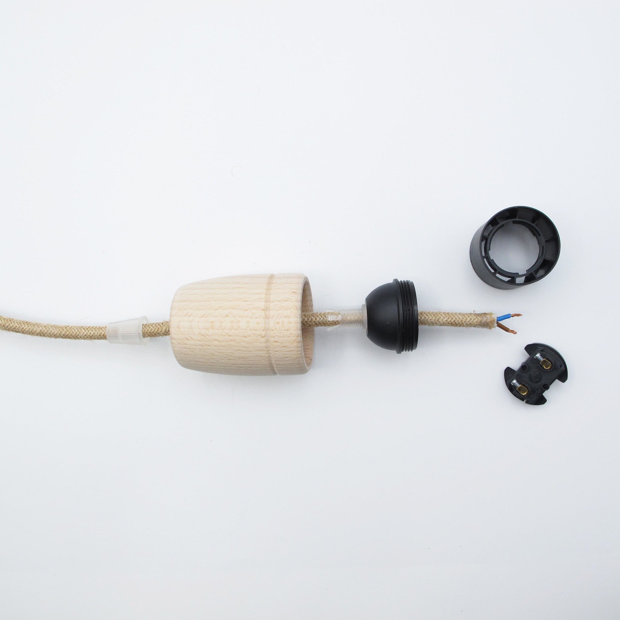 This is the ungrounded, wooden Cylinder lamp holder Woody with an E27 screw thread. This fitting is 64 mm high, has a diameter of 52 mm and is suitable for 2-pole cord. Read more