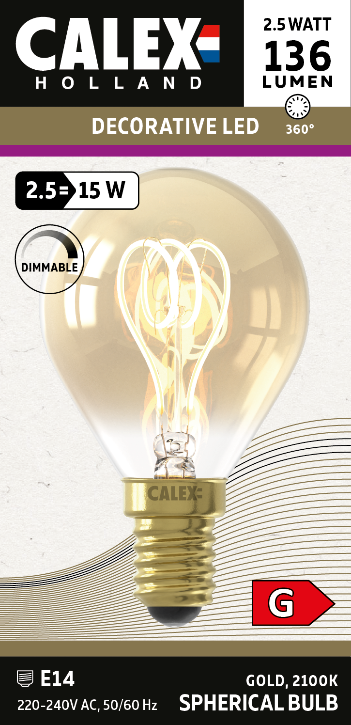 Dit kleine model (E14) heeft een diameter van 45mm, 77mm lang en is geschikt voor fittingen met E14 schroefdraad. De goudkleurige lichtbron van het model P45 (CRI80) heeft een verbruik van 2.5 watt en lichtopbrengst van 136 lumen. De kleurtemperatuur is met 2100 Kelvin extra warm. Volledig dimbaar met een LED dimmer.