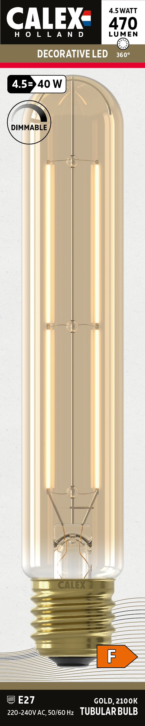 Dit model heeft een diameter van 32 mm, een lengte van 185 mm en is geschikt voor fittingen met E27 schroefdraad. Deze goudkleurige LED lamp van het model T32L heeft een lichtsterkte van 470 Lumen en verbruikt 4,5 watt. De kleurtemperatuur is met 2100 Kelvin extra warm.
