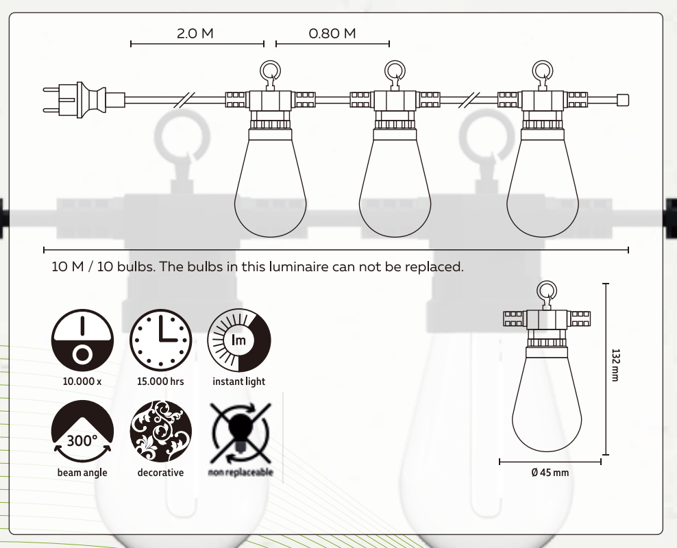 De lichtslinger bevat 10 lampjes en heeft een totale lengte van 10 meter. Tussen elk lampje zit een ruimte van 80 cm, waardoor je de lichtslinger eenvoudig kunt aanpassen aan de gewenste lengte. Het lichtsnoer heeft een stekkerlengte van 2 meter, waardoor je de verlichting eenvoudig kunt aansluiten op het dichtstbijzijnde stopcontact. Let wel: de lampen zijn niet te vervangen (dit kan wel bij het langere snoer van 30 meter).