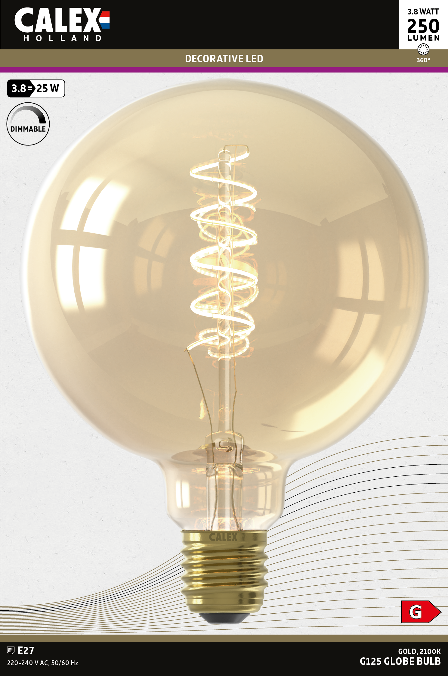 Dit Curved Flex Filament model heeft een diameter van 125 mm en is geschikt voor fittingen met E27 schroefdraad. De goudkleurige lichtbron van het model G125 heeft een lichtopbrengst van 250 Lumen en een verbruik van 4 watt. De kleurtemperatuur is met 2100 Kelvin warm.