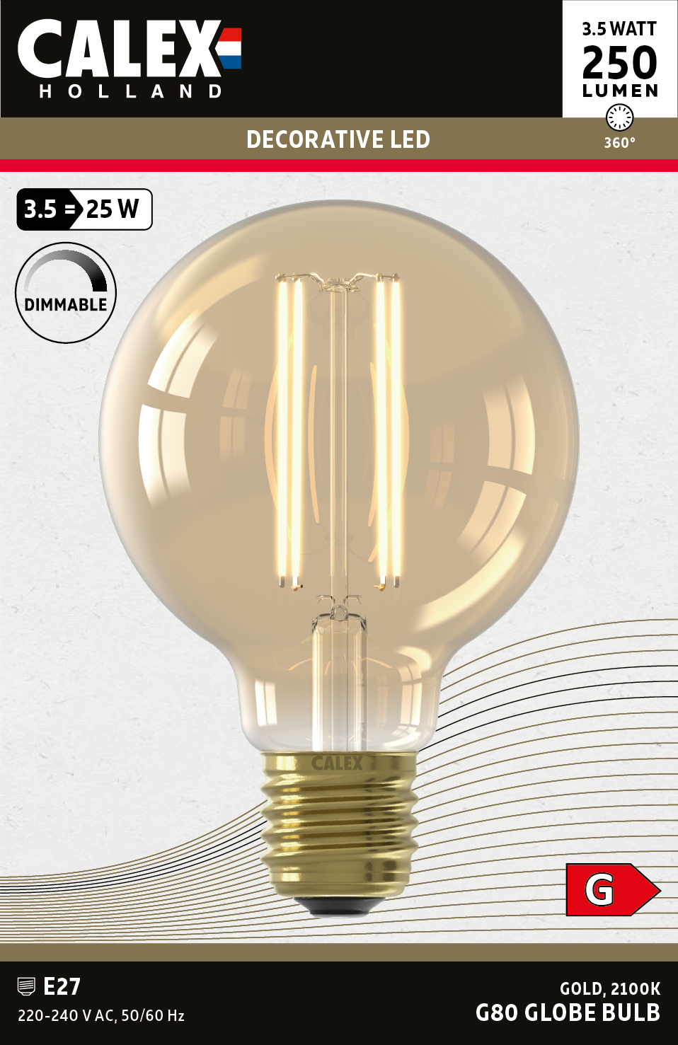 Dit model heeft een diameter van 80 mm en is geschikt voor fittingen met E27 schroefdraad. De gouden lichtbron van het model GLB80 heeft een lichtopbrengst van 250 Lumen en een verbruik van 3.5 Watt. De kleurtemperatuur is met 2100 Kelvin warm.