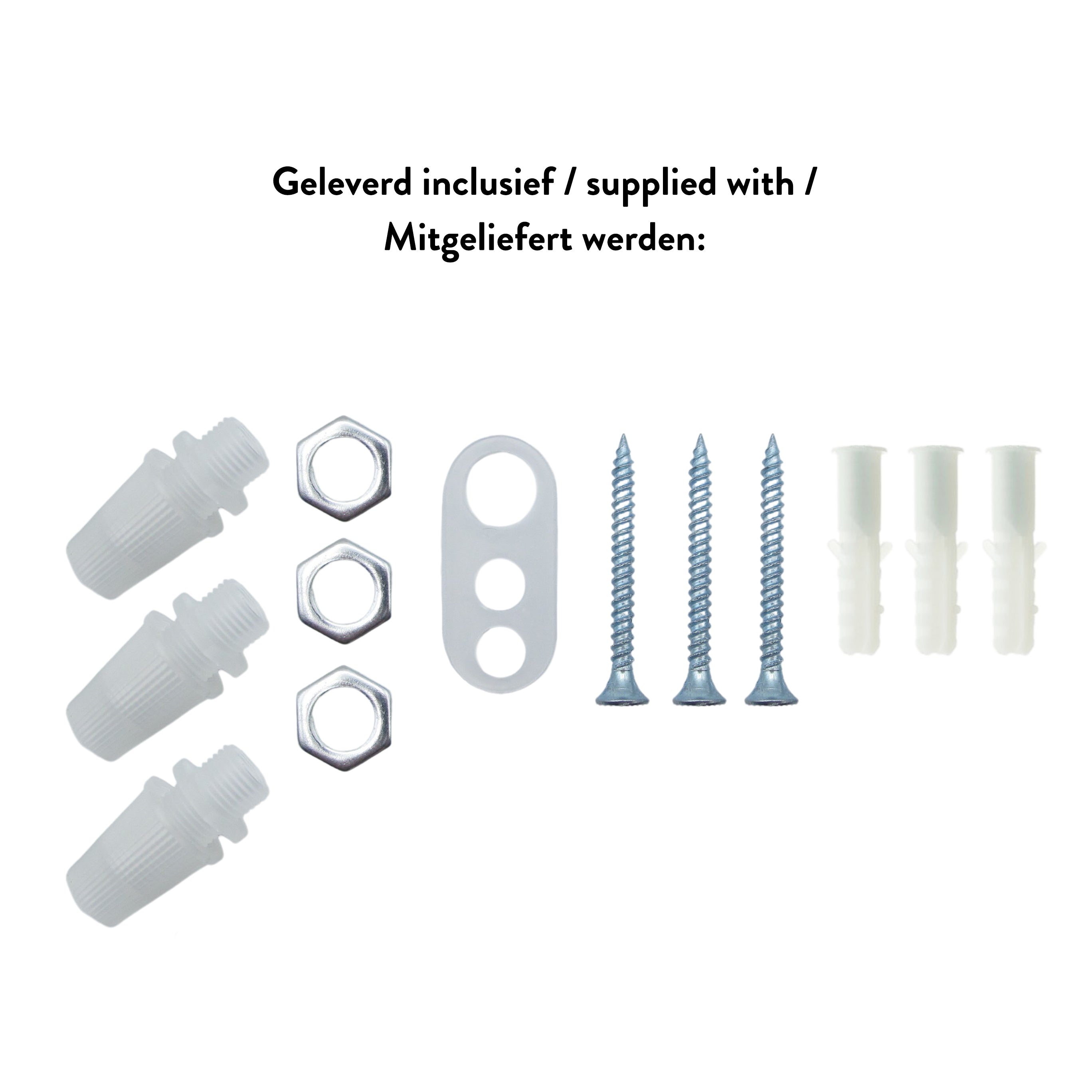 ✓ bevestigingsmateriaal (3 x schroeven + pluggen)