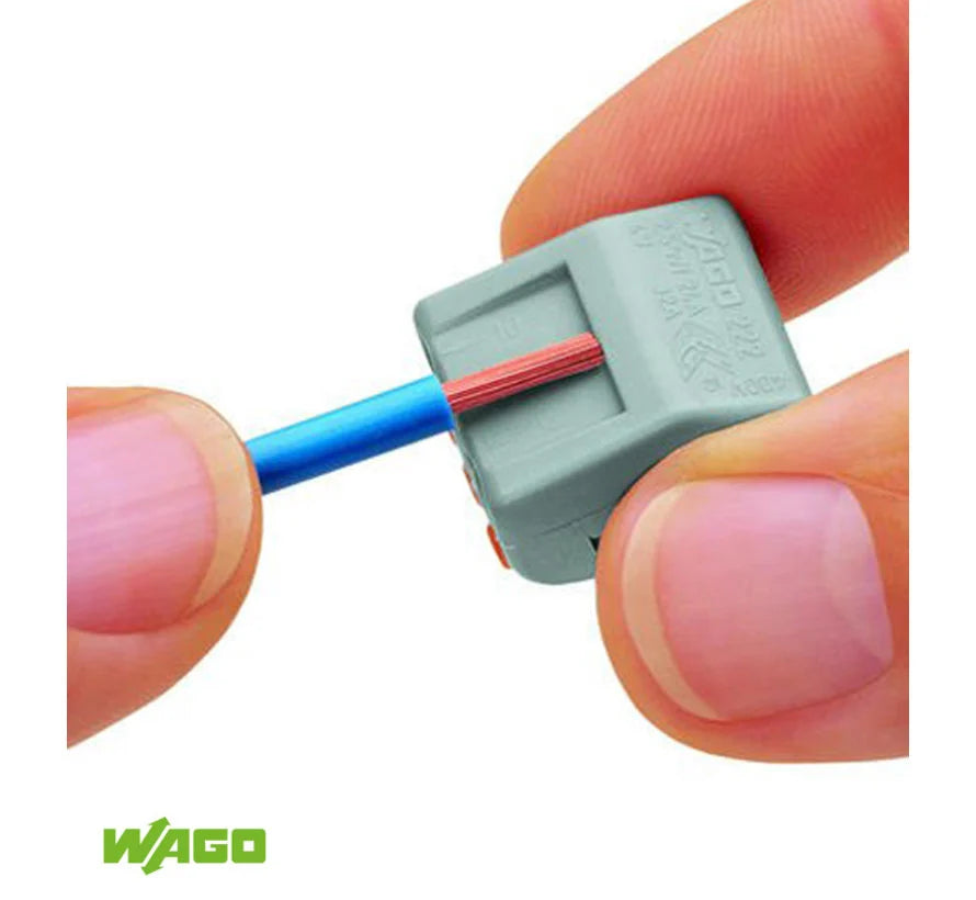 Voordat je begint is het goed om te weten dat je 1 Wago klem per kleur draad gebruikt. Bij een 2-polig snoer (blauwe+bruine draad), gebruik je dus 2 aparte klemmen. Bij een 3-polig snoer, gebruik je 3 klemmen. 1 klem voor alle blauwe draden, 1 klem voor alle bruine draden en 1 klem voor alle geel/groene draden.